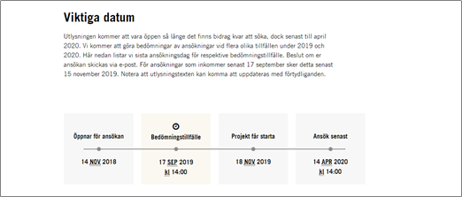 Visar öppna, kommande och annonserade ansökningsomgångar för ett eller flera angivna diarienummer. Används främst på mikrosajter.